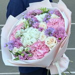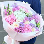 alstroemeria white - 4 pcs hydrangea pink - 3 pcs hydrangea white - 2 pcs wrapping paper - 5 pcs mathiola purple - 7 pcs chrys santini - 5 pcs