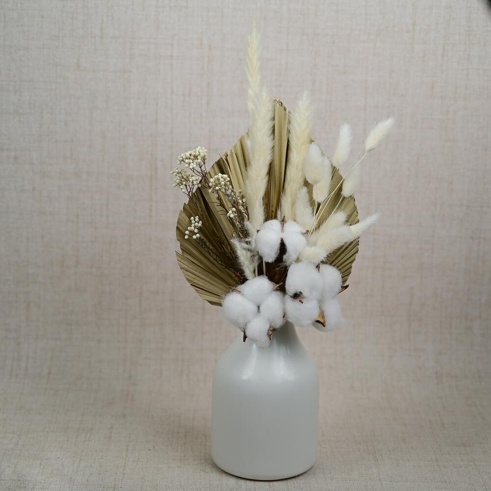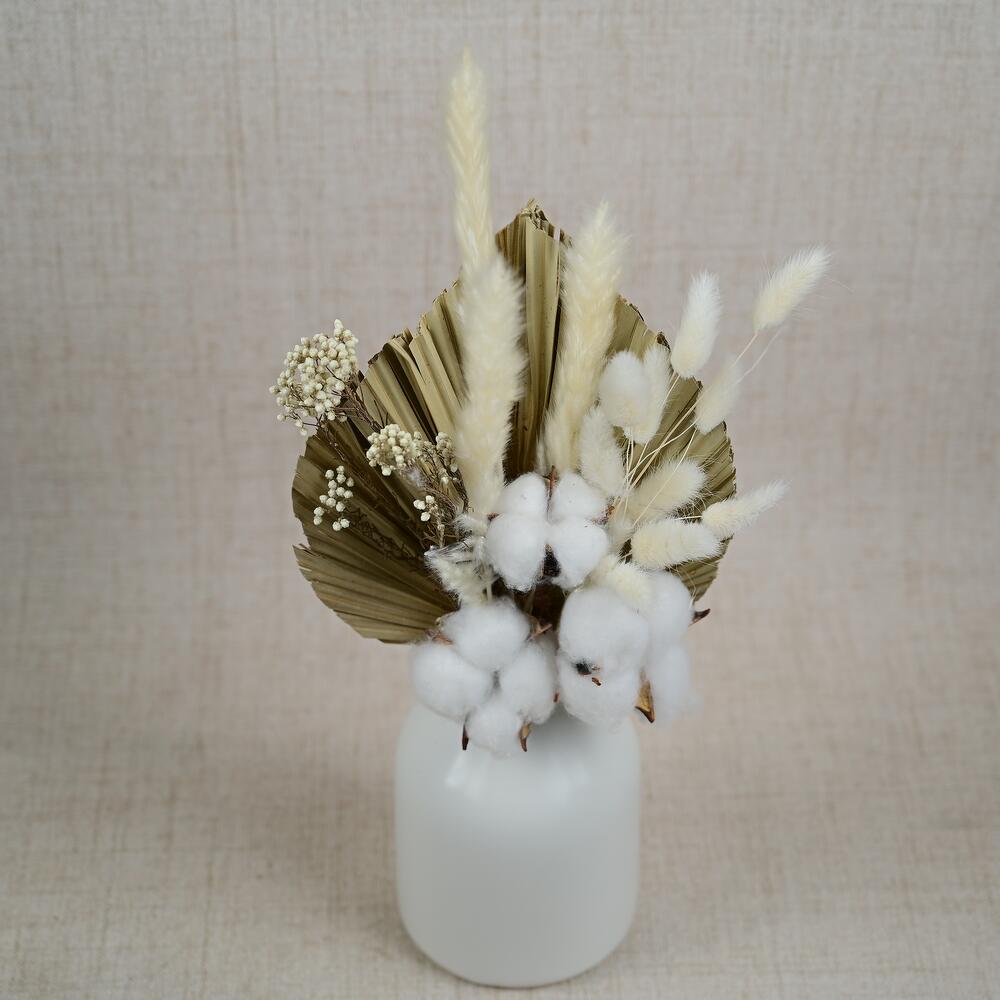 Transform your space with the enchanting beauty of our Desert Dreams - Preserved Flowers Ceramic Vase. This exquisite arrangement features a thoughtfully curated selection of preserved flowers that capture the serene essence of desert landscapes, making it an ideal centerpiece for any setting. Arrangement Includes: 1 Palm Leaf, 3 Gossypium, 9 Bunny Tails, 1 Ozothamnus, and 3 Small Pampas. Product Details: Elegantly presented in a stylish ceramic vase, this arrangement is designed to last, allowing you to enjoy its natural beauty without the need for maintenance. Perfect for home decor, weddings, or as a thoughtful gift. The combination of soft bunny tails, vibrant gossypium, and delicate small pampas creates a visually stunning display, while the palm leaf and ozothamnus add unique textures and a touch of greenery to the arrangement. At Fellora Flower Boutique, we pride ourselves on using high-quality preserved flowers to ensure your arrangement remains beautiful for years to come. Share the charm of our Desert Dreams - Preserved Flowers Ceramic Vase with someone special or treat yourself to a captivating floral experience!