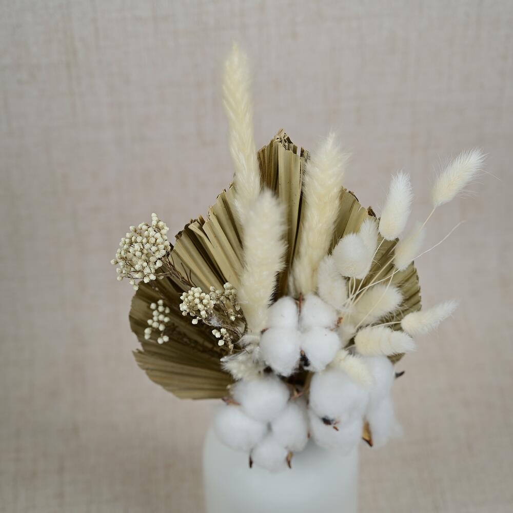 palm - 1 pcs ozothamnus - 1 pcs bunny tail - 9 pcs small pampas - 3 pcs gossipium - 3 pcs