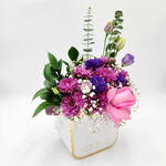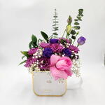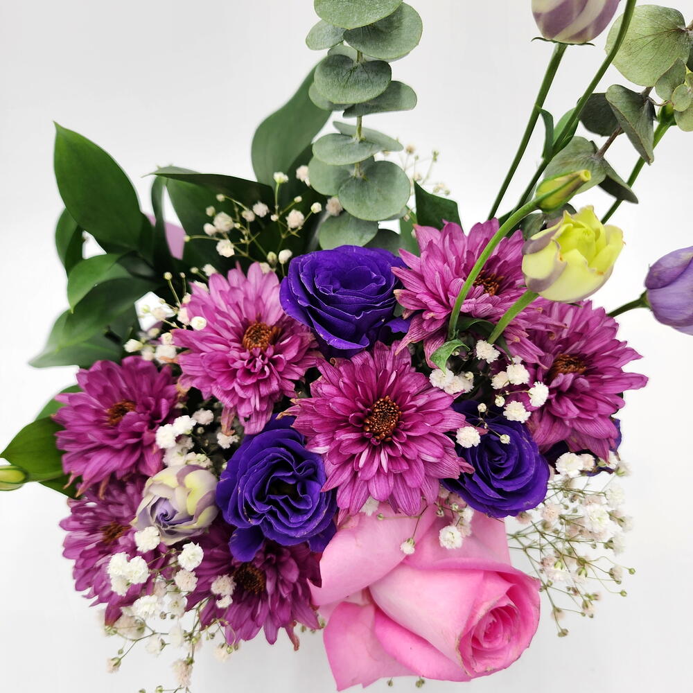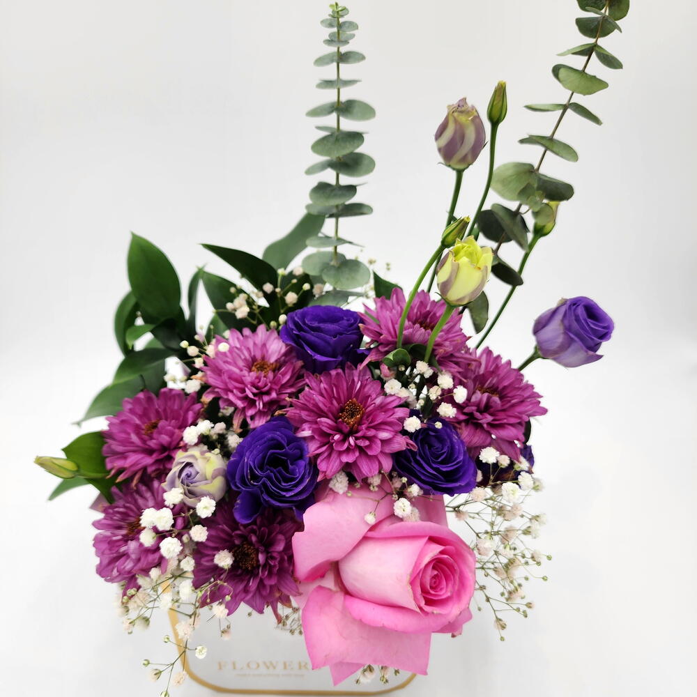 Chrysanthemum - 3 pcs eucalyptus leaves - 1 pcs fresh pink rose - 1 pcs babys breath - 2 pcs estoma purple - 3 pcs fresh ruscus leaves - 3 pcs white chic box - 1 pcs