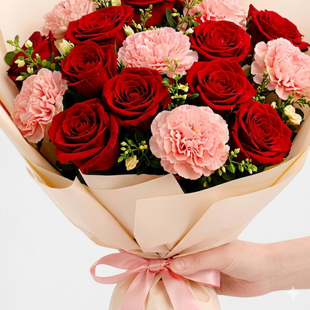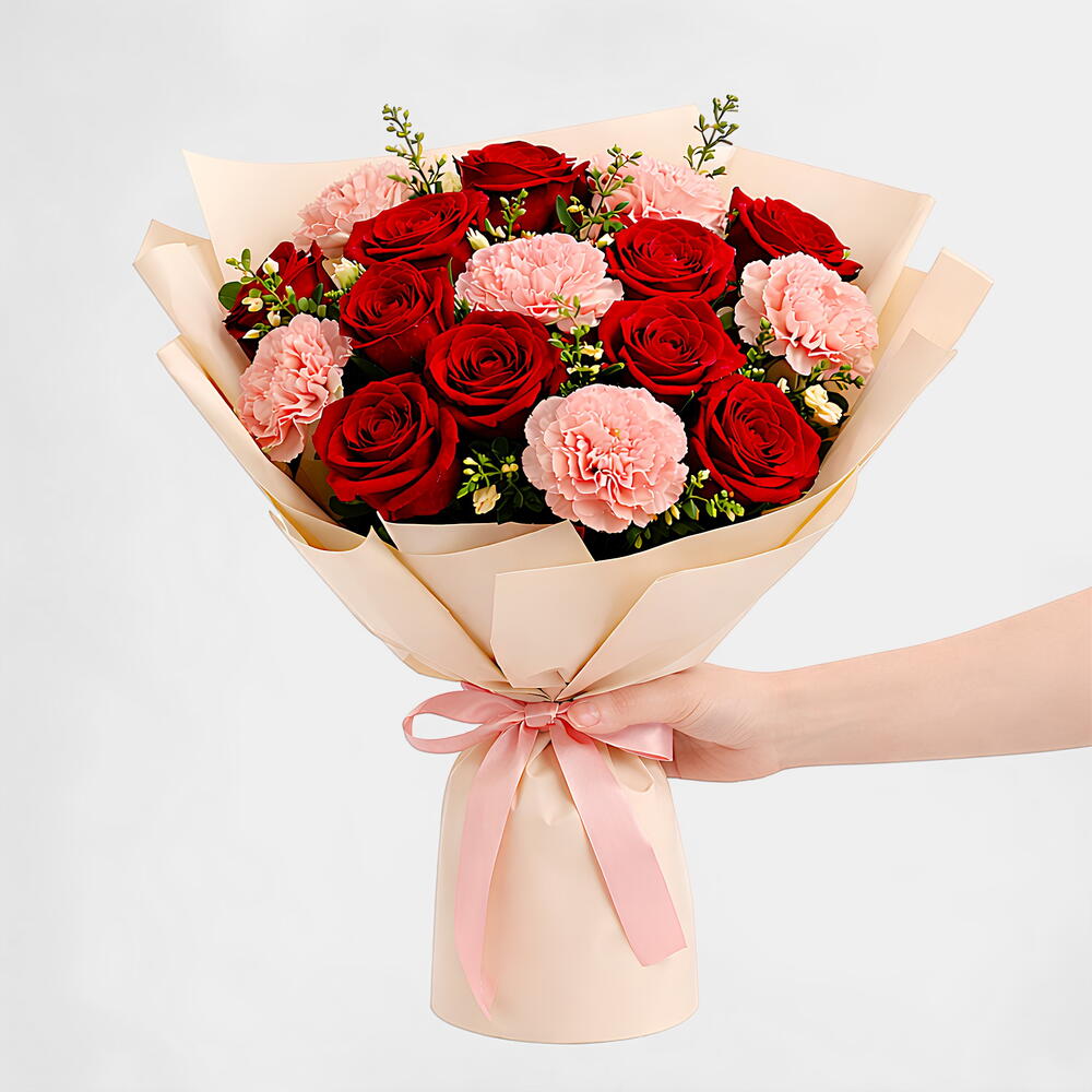 Bright, cheerful, and full of meaning — this festive bouquet of 6 red roses and 5 pink carnations captures the essence of love, happiness, and celebration. The bold red roses represent deep affection, while the soft pink carnations add a touch of warmth and tenderness, creating the perfect harmony of color and emotion. Ideal for birthdays, anniversaries, festive gifting, or joyful surprises, this bouquet adds elegance and charm to every occasion. Celebrate with beauty and joy — order your Red Roses Pink Carnations Bouquet today for same-day Dubai delivery!