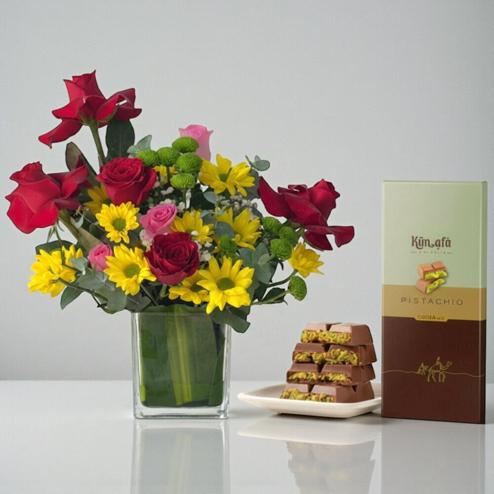 Red rose - 5 pcs Eucalyptus - 5 pcs Pink rose - 3 pcs Vase - 1 pcs yellow chresanthemum - 3 pcs pistachio malakiya kunafa chocolate bar (160g) - 1 pcs