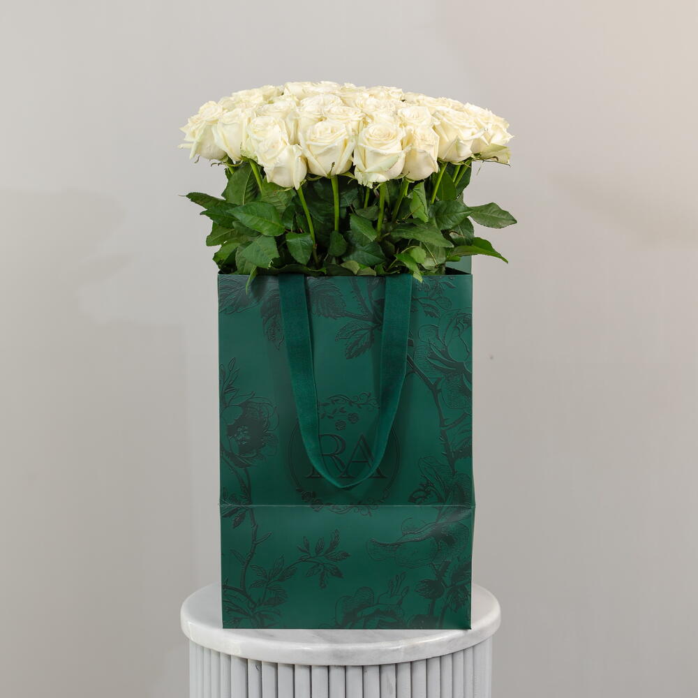 white roses - 51 pcs protective wrapping - 1 pcs hydration pack - 1 pcs branded premium carry bag - 1 pcs personalized message envelope card - 1 pcs branded rose art ribbon - 1 pcs branded tag - 1 pcs