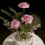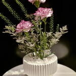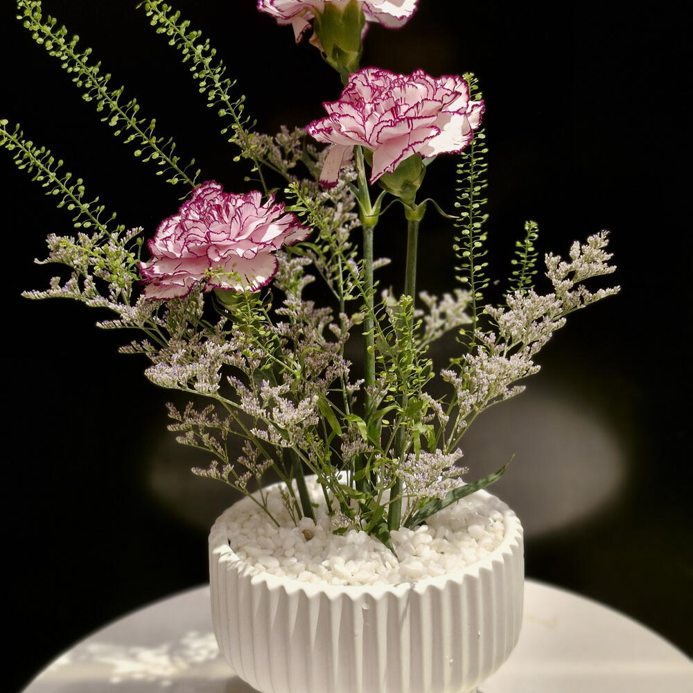 gypso - 4 pcs white vase - 1 pcs pink and white double shade carnation - 3 pcs pebbles - 5 pcs green filling - 4 pcs