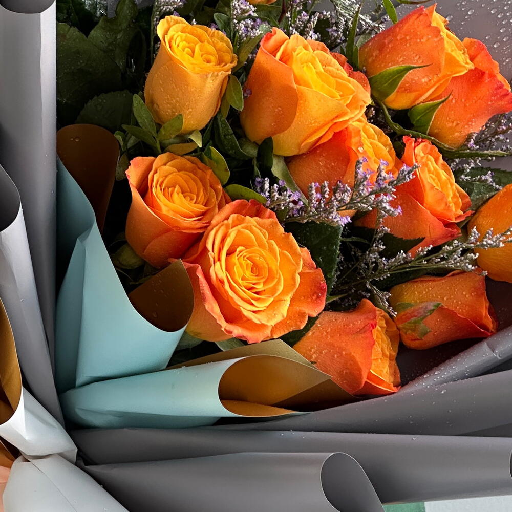 Greenery - 1 pcs Limonium - 4 pcs orange rose - 12 pcs eucalyptus leaves - 2 pcs