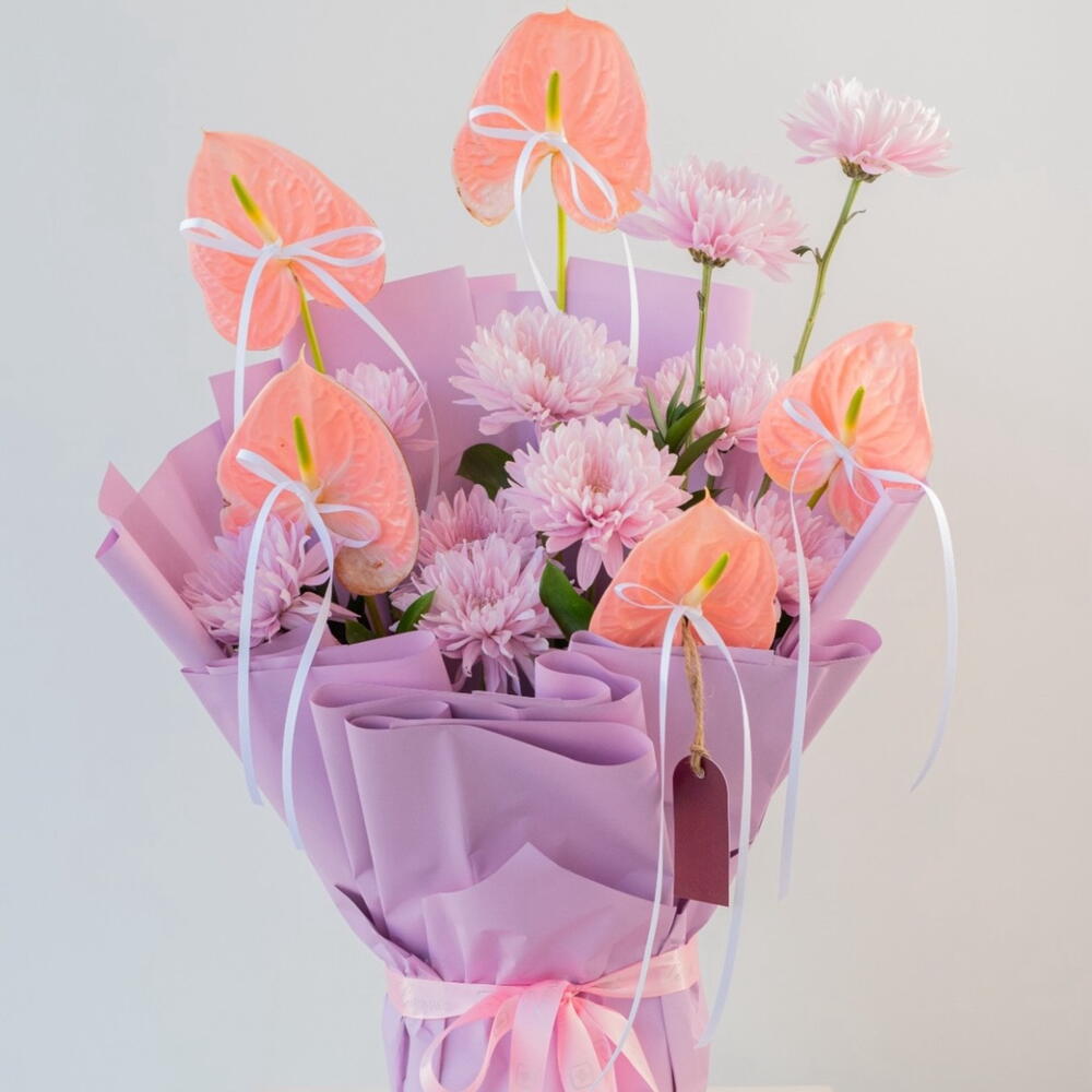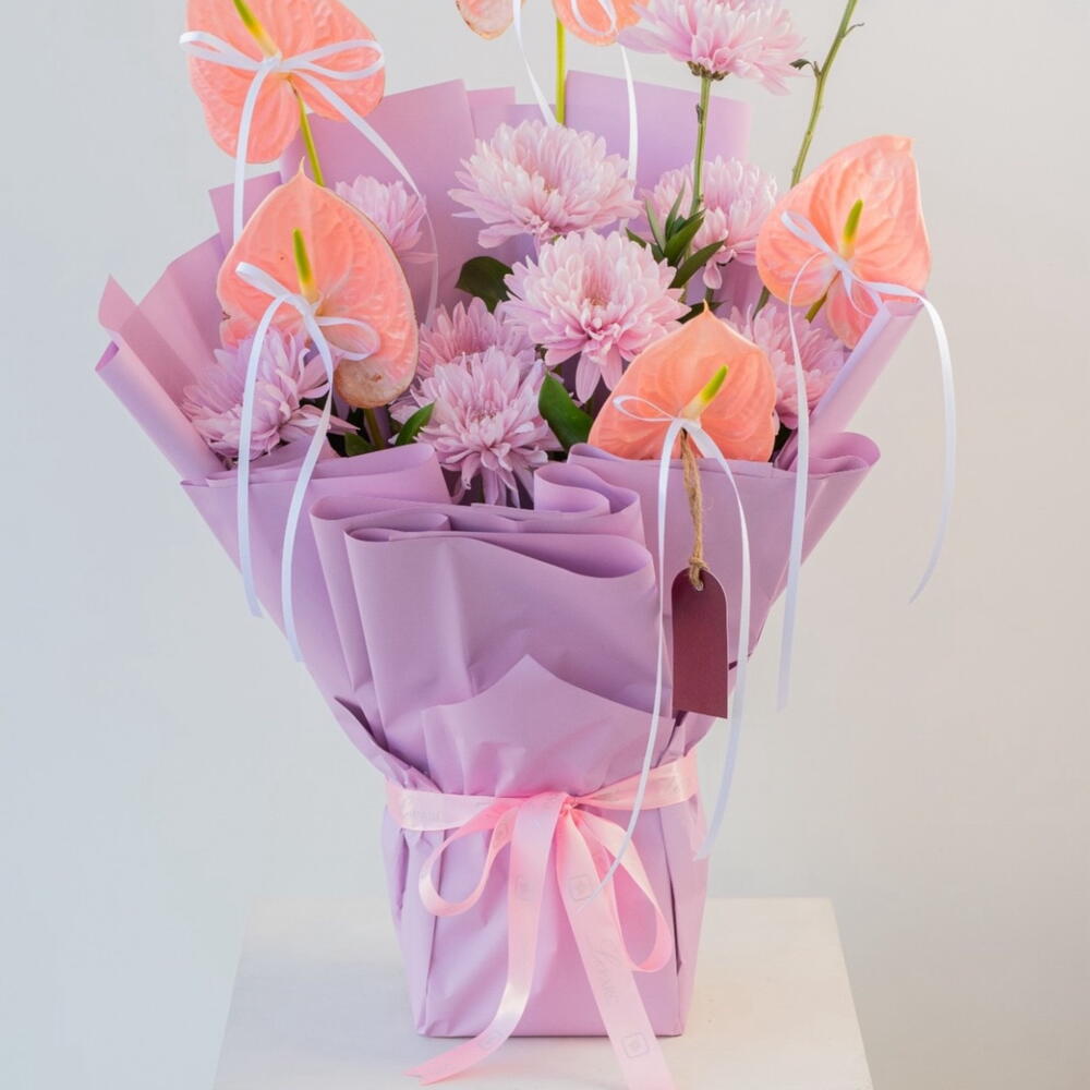 Dream is a sophisticated celebration of elegance, texture, and modern floral artistry. Featuring 10 large, lush purple chrysanthemums paired with exotic anthuriums, each bloom is accented with delicate tiny white bows and hand-selected for vibrancy, freshness, and flawless petals. Wrapped in luxurious purple paper, this arrangement exudes refined style, contemporary charm, and couture-worthy allure. Perfect for your girlfriend, wife, fiancée, or the woman who brings life and color to every room, Dream is ideal for birthdays, anniversaries, congratulations, or simply making a bold, elegant statement. Each flower conveys sophistication, admiration, and thoughtful luxury, making this bouquet a collector-worthy floral masterpiece. Send it from a devoted partner, loving husband, or admirer to express luxury, elegance, and heartfelt sentiment. Dream isn’t just flowers — it’s a poetic, Instagram-ready bouquet that captures attention, available for same-day delivery in Dubai and across the UAE. ✨ Dream — because every moment deserves to bloom in purple elegance.