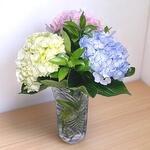 hydrangea pink - 1 pcs hydrangea white - 1 pcs glass vase - 1 pcs hydrangea blue - 1 pcs
