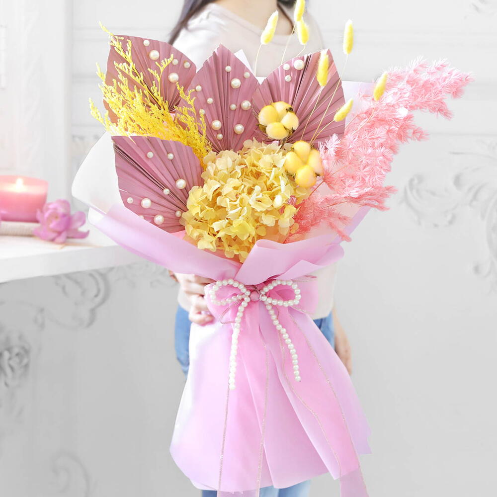 Hydrangea - 1 pcs Limonium - 1 pcs asparagus - 1 pcs cotton flower - 2 pcs table palm dried - 4 pcs
