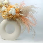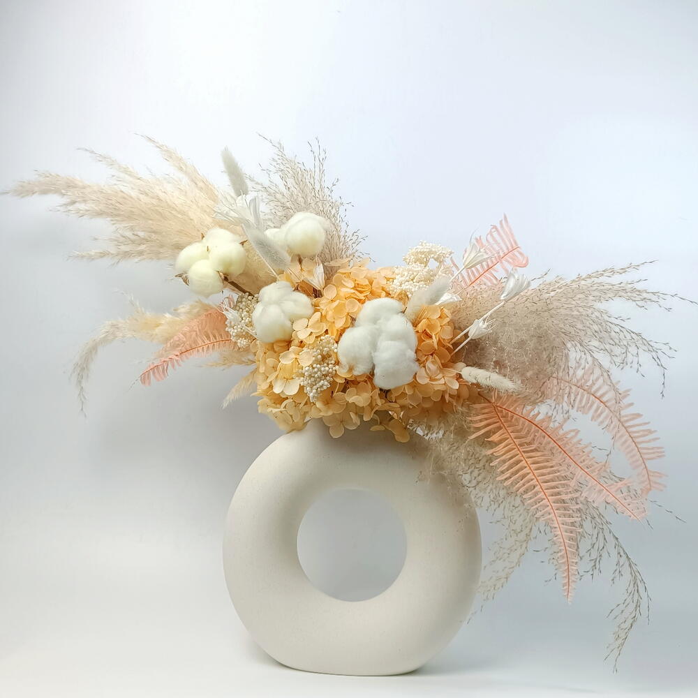 Bring soft, boho luxury to any space with this elegant dried flowers arrangement styled in a modern donut vase. Designed in warm nude, peach, and ivory tones, it’s a long-lasting preserved flowers piece that needs zero maintenance—no watering, no wilting, just effortless beauty all year round. Perfect as a home décor flower arrangement, office desk centerpiece, or a thoughtful gift for birthday, anniversary, housewarming, or congratulations moments. With airy textures and a delicate pastel palette, this arrangement adds a calm, premium vibe to minimalist, modern, or bohemian interiors—an ideal choice if you want something unique beyond a fresh bouquet.