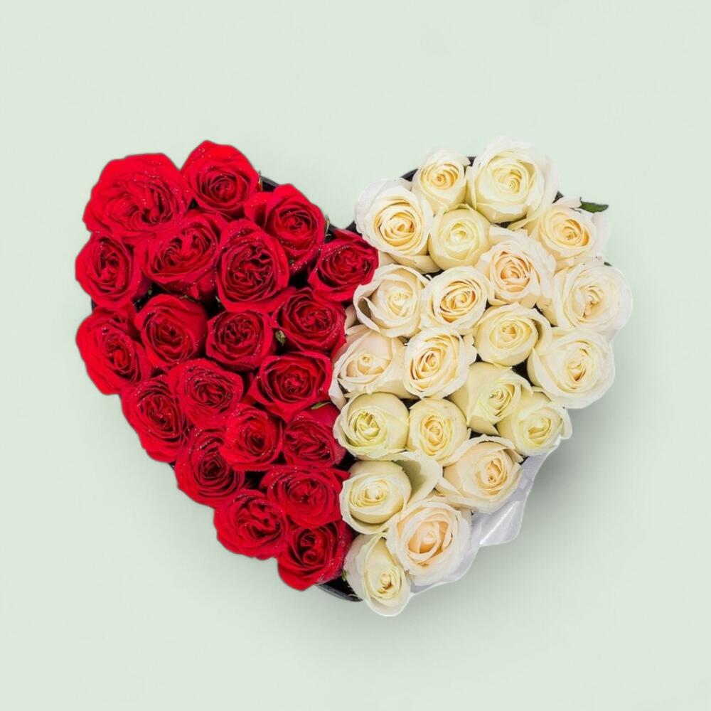 A striking heart-shaped arrangement beautifully divided, showcasing a vibrant half of rich red roses perfectly contrasted with a half of creamy white roses. This unique and elegant presentation symbolizes unity, passion, and purity, making it an ideal gift to express multifaceted love. (this arrangement has heart shape Sponge with wrap)