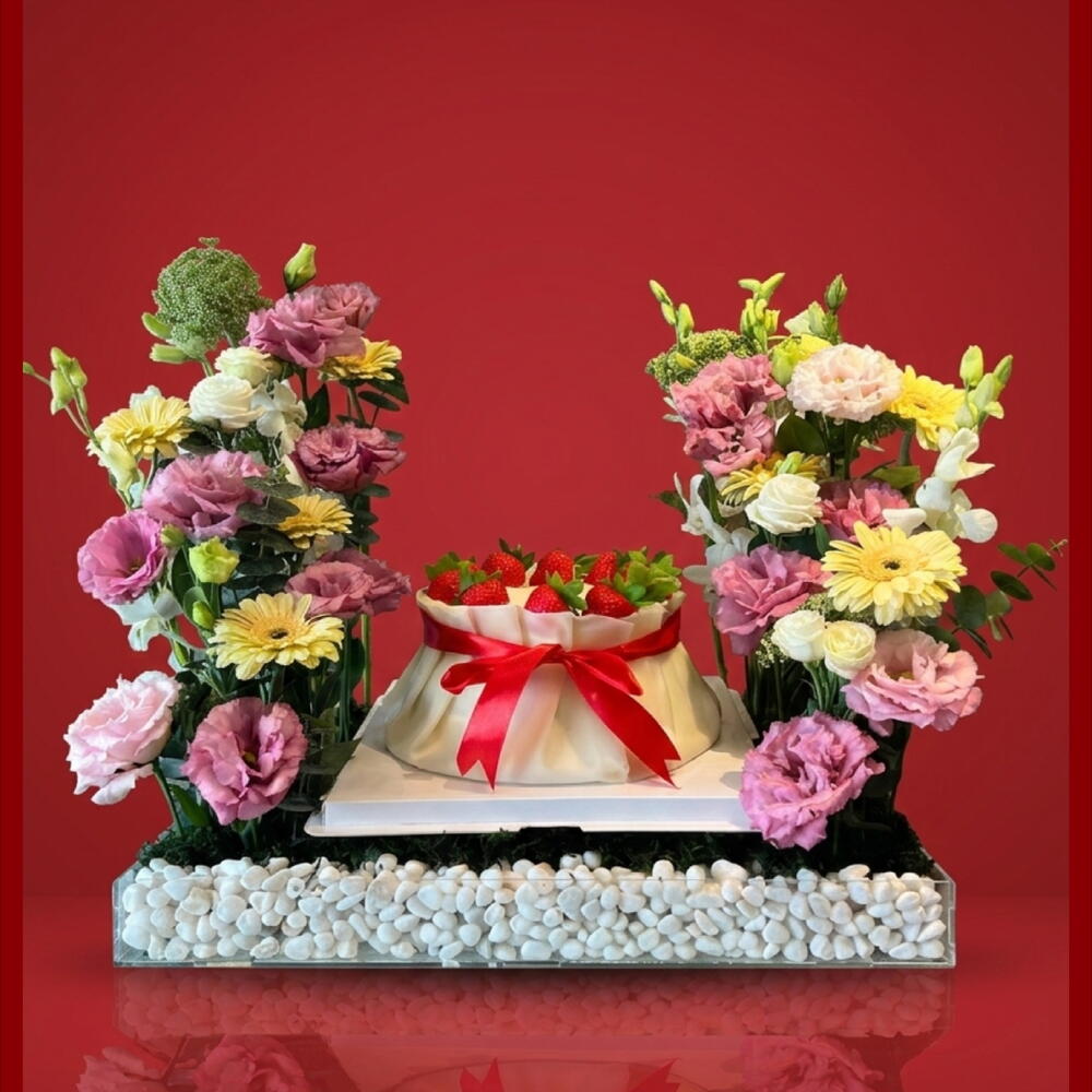 Immerse yourself in the magic of floral artistry with this exclusive offering from our Florists Specials. This stunning composition comprises of a thoughtful selection of seven cheerful Gerberas, intricately arranged with five exquisite Lisianthus. Adding to the charm of the bouquet are two delicate Baby Roses and two ethereal Ammi Visnaga. Paired with a chic Acrylic Tray, this bouquet also comes with a delightful Dumpling Cake, thus making it a full package of joy and beauty. Serenade your senses or bring a smile to a loved one with this splendid piece from our collection.