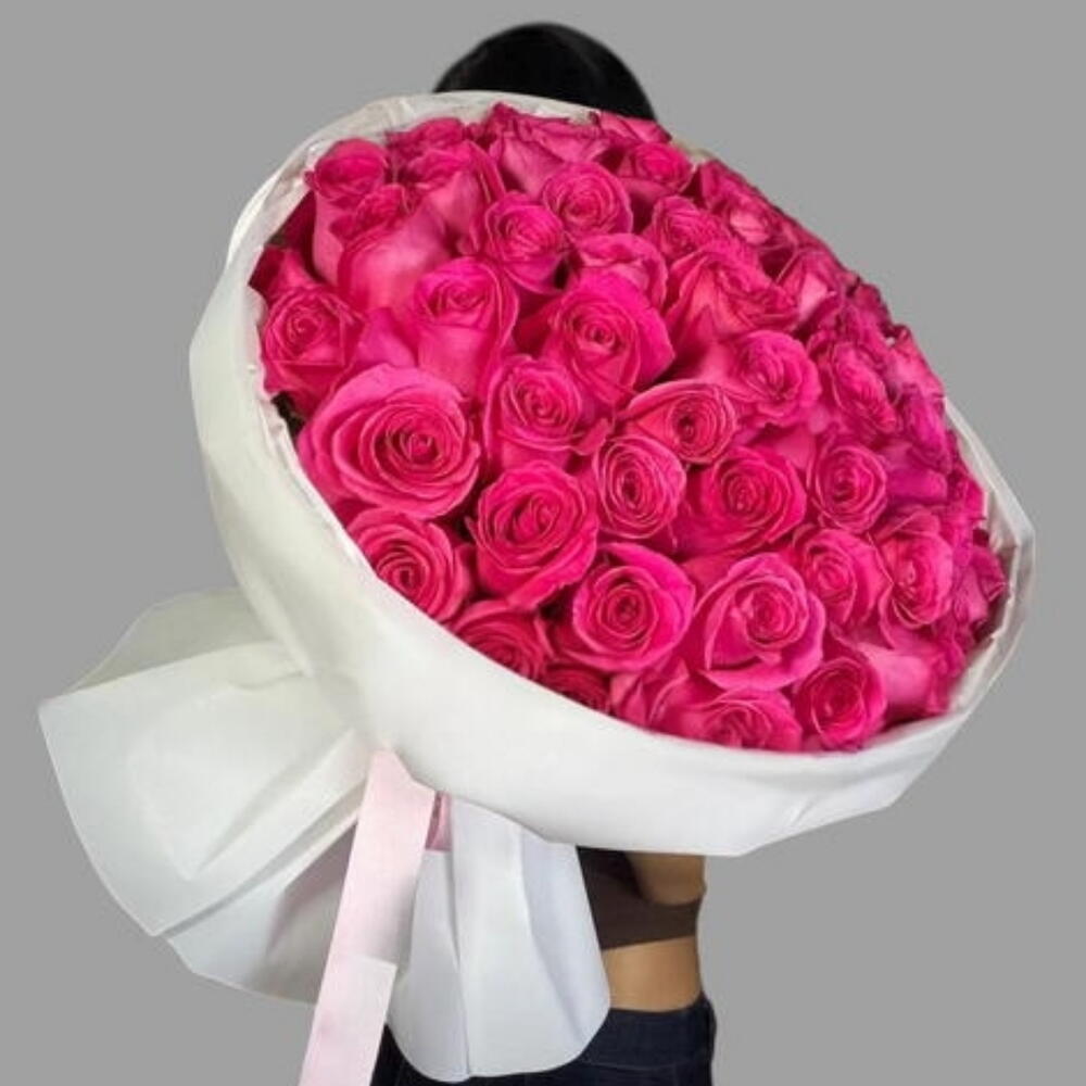 Flowers: The bouquet consists of numerous pink roses, which are often associated with appreciation, pure love, femininity, and grace. Wrapping: The arrangement is elegantly wrapped in white paper, which provides a striking contrast to the soft pink hues of the roses. Ribbon: A light pink ribbon is tied around the base of the wrapping to secure the bouquet.