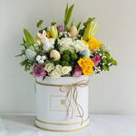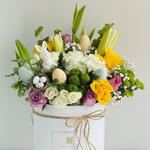 Celebrate the beauty of Easter with our elegant Easter Bunny Bloom Box, thoughtfully designed in a stylish box arrangement featuring 1 lush white hydrangea, 2 graceful white lilies, 3 radiant yellow roses, 4 rich purple roses, 2 delicate white spray roses, and 2 fresh green chrysanthemums. Finished with 4 mixed-color Easter eggs and a charming bunny decoration, this luxurious floral box brings a perfect blend of spring freshness and festive joy, making it an ideal gift or centerpiece for Easter celebrations. 🌷🐰🥚✨