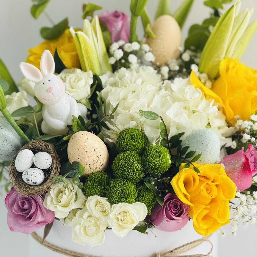 Celebrate the beauty of Easter with our elegant Easter Bunny Bloom Box, thoughtfully designed in a stylish box arrangement featuring 1 lush white hydrangea, 2 graceful white lilies, 3 radiant yellow roses, 4 rich purple roses, 2 delicate white spray roses, and 2 fresh green chrysanthemums. Finished with 4 mixed-color Easter eggs and a charming bunny decoration, this luxurious floral box brings a perfect blend of spring freshness and festive joy, making it an ideal gift or centerpiece for Easter celebrations. 🌷🐰🥚✨