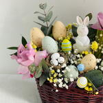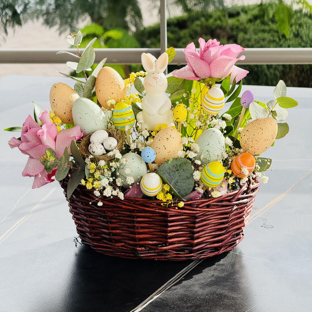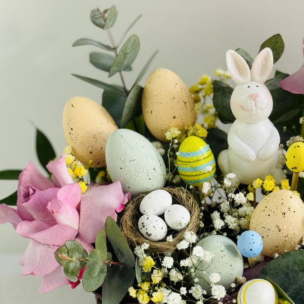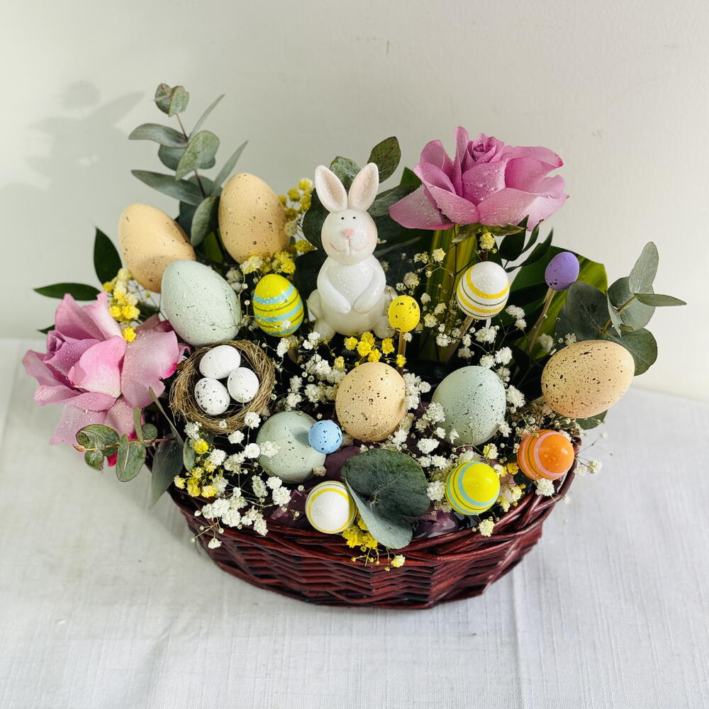 Celebrate the joy of Easter with our charming Easter Bunny Egg Nest Basket, beautifully arranged with 2 elegant purple roses, delicate gypsophila, fresh eucalyptus, and a festive display of 15 mixed-color Easter eggs. Finished with a cute bunny decoration and a decorative nest filled with eggs, all thoughtfully presented in a lovely basket, this delightful arrangement brings a perfect blend of spring charm and seasonal cheer, making it an ideal gift or Easter décor piece. 🐰🥚💜✨