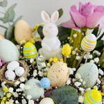Eucalyptus - 2 pcs Gypsophila - 2 pcs purple roses - 2 pcs toy rabbit - 1 pcs mixed-colour easter eggs - 10 pcs
