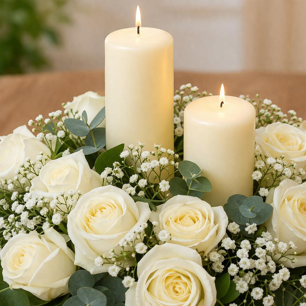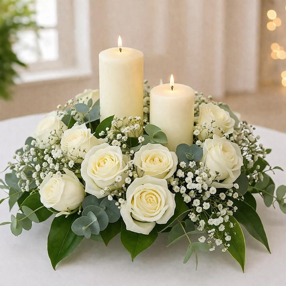 Perfect table center piece for Easter.This floral arrangement is an elegant, low-profile centerpiece that combines soft textures with a warm glow. It features a lush base of creamy white roses in full bloom, accented by delicate sprigs of gyphsophilia and small clusters of waxflowers. The greenery consists of silvery Eucalyptus leaves and Ruskcus. At the heart of the display are two ivory pillar candles of staggered heights, creating a classic and serene focal point suitable for weddings, formal dinners, or memorial services.