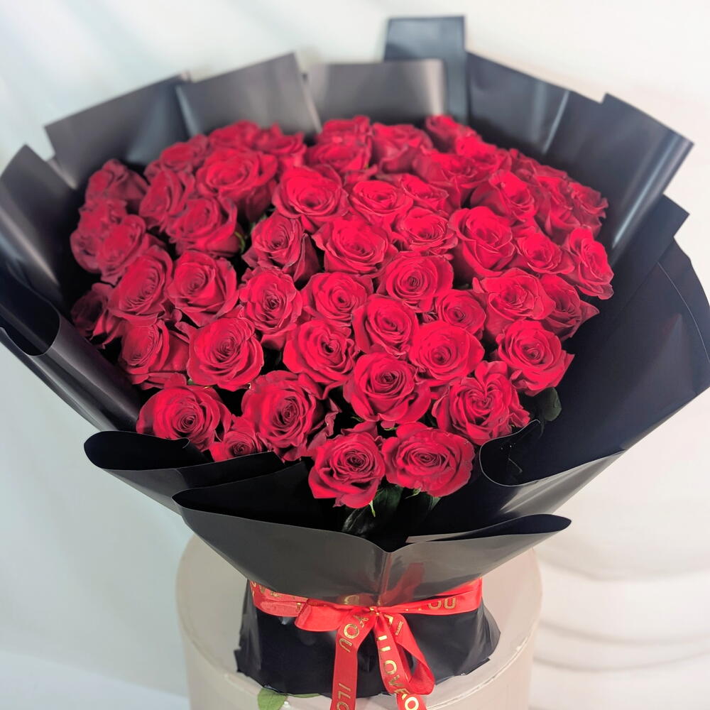 This luxurious bouquet features an abundant arrangement of premium red roses, carefully hand-tied and wrapped in elegant black paper for a bold, timeless look. Each rose symbolizes deep love, passion, and admiration, making this bouquet a powerful expression of heartfelt emotions. Finished with a charming red ribbon, it creates a striking contrast that enhances its romantic appeal. Perfect for celebrating special moments, this arrangement is an ideal birthday gift, anniversary surprise, or romantic gesture to say “I love you” in the most beautiful way. Whether gifted to a partner, spouse, or someone special, this stunning bouquet leaves a lasting impression and turns any occasion into an unforgettable celebration.
