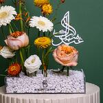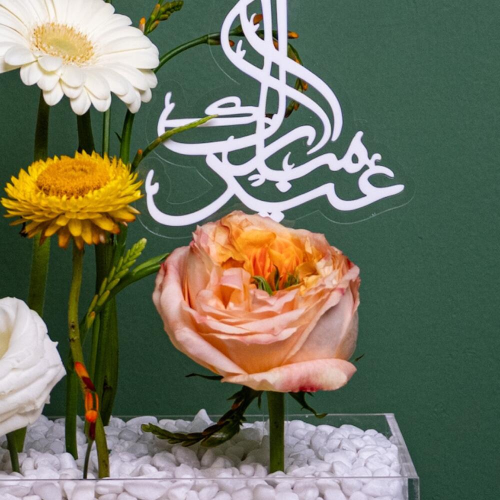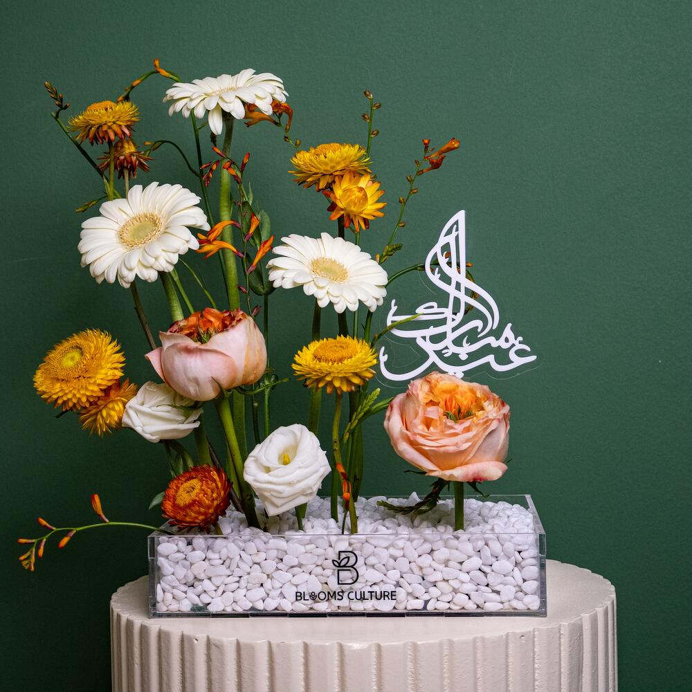 A radiant celebration of elegance and vibrancy, “Serene Bloom” features a delightful mix of soft peach roses, pure white gerberas, and bright yellow strawflowers, delicately arranged in a sleek, clear vase filled with white pebbles. The arrangement is accented with a touch of green and adorned with a modern Arabic calligraphy topper, adding a culturally rich and heartfelt touch. Perfect for commemorating special occasions or simply brightening up any space.