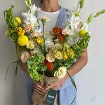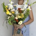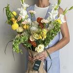 Freesia - 3 pcs carnations - 5 pcs hydrangeas - 3 pcs celosia - 2 pcs gladiolus - 3 pcs lisiantus - 3 pcs panicum - 4 pcs chrysanthemum ping pong - 3 pcs mollucela - 3 pcs rosa spray gentile trendestter - 2 pcs
