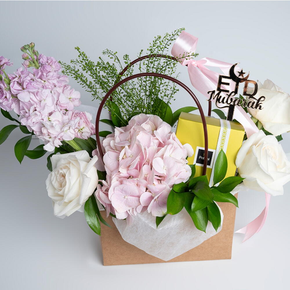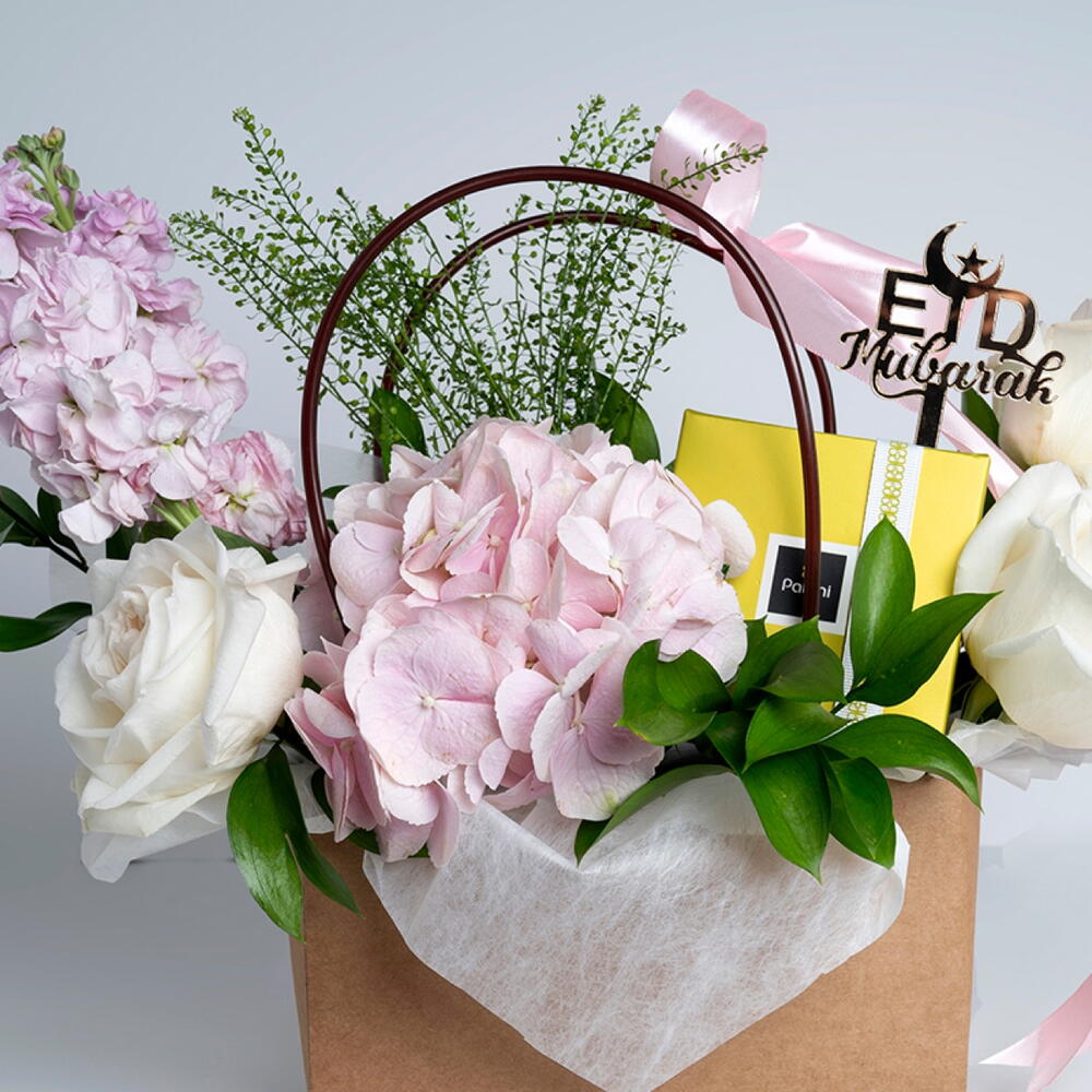 Mixed flowers and a Patchi chocolate box of 250 grams arranged in a paper bag