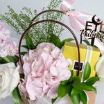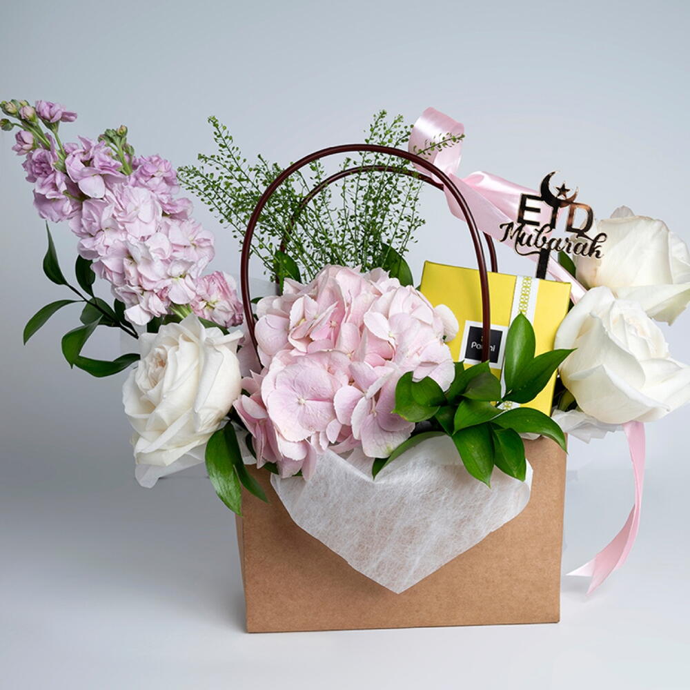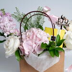 Ruscus - 5 pcs Hydrangea - 1 pcs ribbon satin - 1 pcs mathiola - 2 pcs white ohara - 3 pcs paper bag - 1 pcs lipidium - 1 pcs patchi 250 gram box - 1 pcs