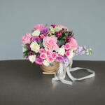 Pink rose - 5 pcs Leaves - 4 pcs purple rose - 6 pcs baby rose pink - 3 pcs mathiola purple - 2 pcs austromeria white - 2 pcs