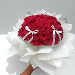 Bold, romantic, and unforgettable — this luxurious bouquet of velvety red roses is a true declaration of love. Each rose is meticulously arranged into a stunning dome, wrapped in lavish white paper that enhances its deep, passionate color. Elegant white satin bows add a graceful, celebratory touch to this dramatic floral masterpiece. Whether youre expressing heartfelt emotions or celebrating a grand occasion, this bouquet speaks louder than words. Perfect for anniversaries, proposals, or simply making someone feel deeply cherished. It’s not just a bouquet — it’s a breathtaking experience in bloom. Make a statement they’ll never forget.