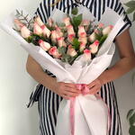 Ribbon - 1 pcs Pink rose - 25 pcs Wrapping - 5 pcs Greens - 4 pcs
