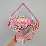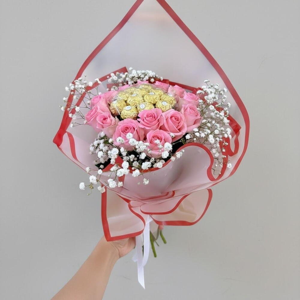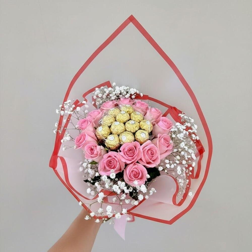 This charming bouquet is a delightful combination of soft pink roses, delicate babys breath, and luxurious golden chocolates. Wrapped in elegant sheer paper with a red border, this bouquet exudes romance and sophistication. Perfect for special occasions like birthdays, anniversaries, or as a heartfelt gift to express love and appreciation. To keep your bouquet fresh, trim the stems at an angle before placing them in a vase with clean water. Change the water every two days and keep the bouquet away from direct sunlight and heat sources. The chocolates should be stored in a cool, dry place to maintain their quality.
