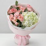 Eucalyptus - 2 pcs pink carnations - 4 pcs white hydrangea - 2 pcs pink peony roses - 5 pcs