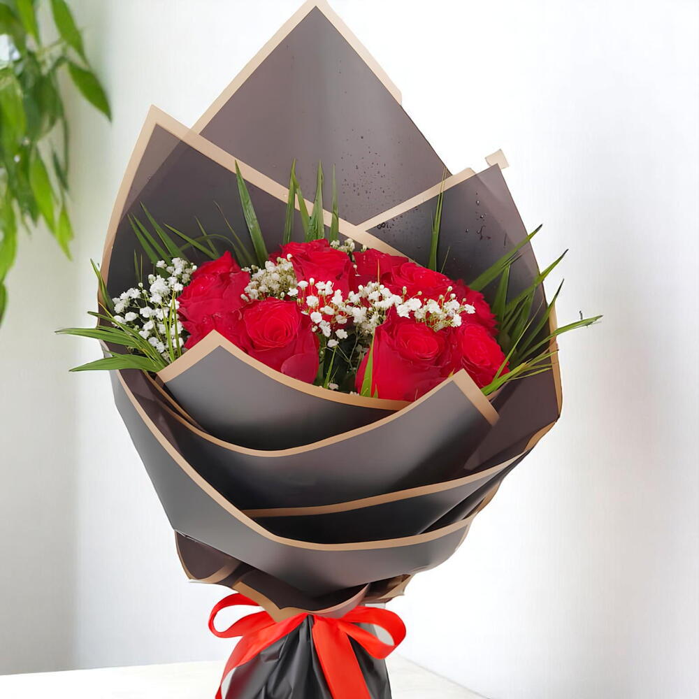 Elegant Bouquet Red Roses with Gypsophila