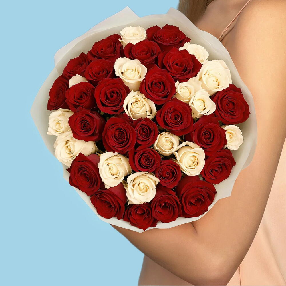 A stunning bouquet of 35 white and red roses, symbolizing the perfect blend of purity and passion. This elegant arrangement is ideal for expressing heartfelt emotions and celebrating special moments.