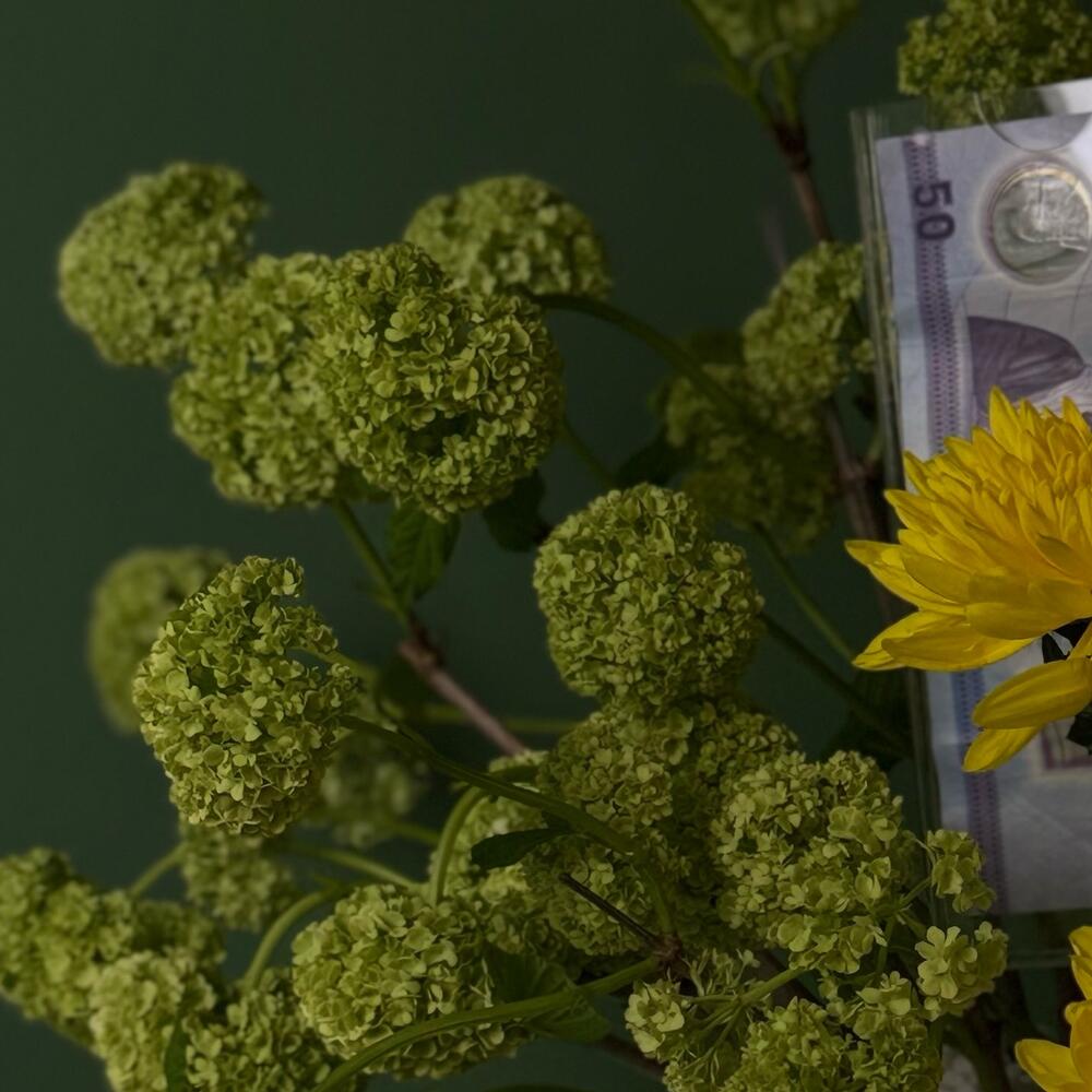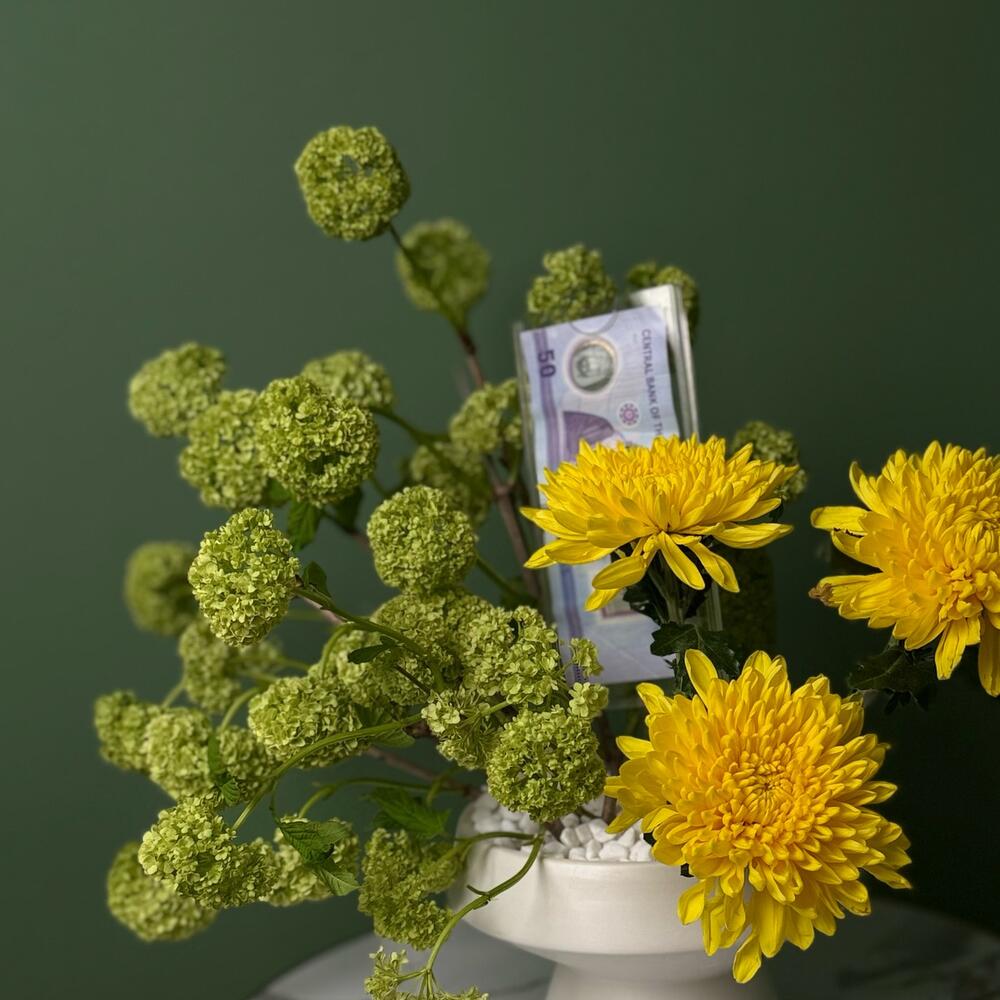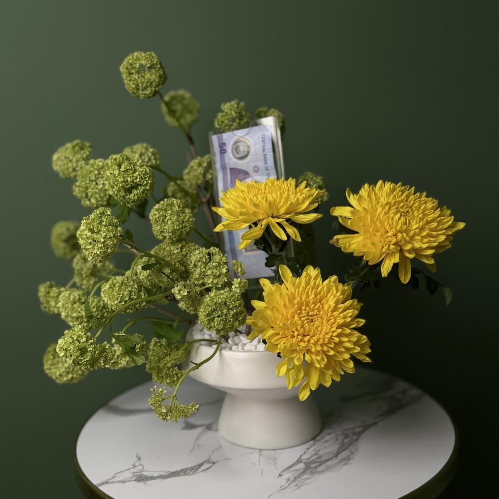 An exquisite arrangement of three beautiful Chrysanthemums and eight sprawling Viburnums, thoughtfully presented in a single ceramic vase. Adding a unique touch, this florists special also includes an adorable money box, making it the perfect combination of aesthetics and utility. This blend of vibrant flowers and practical elements serves as an excellent gift or addition to your home decor.