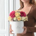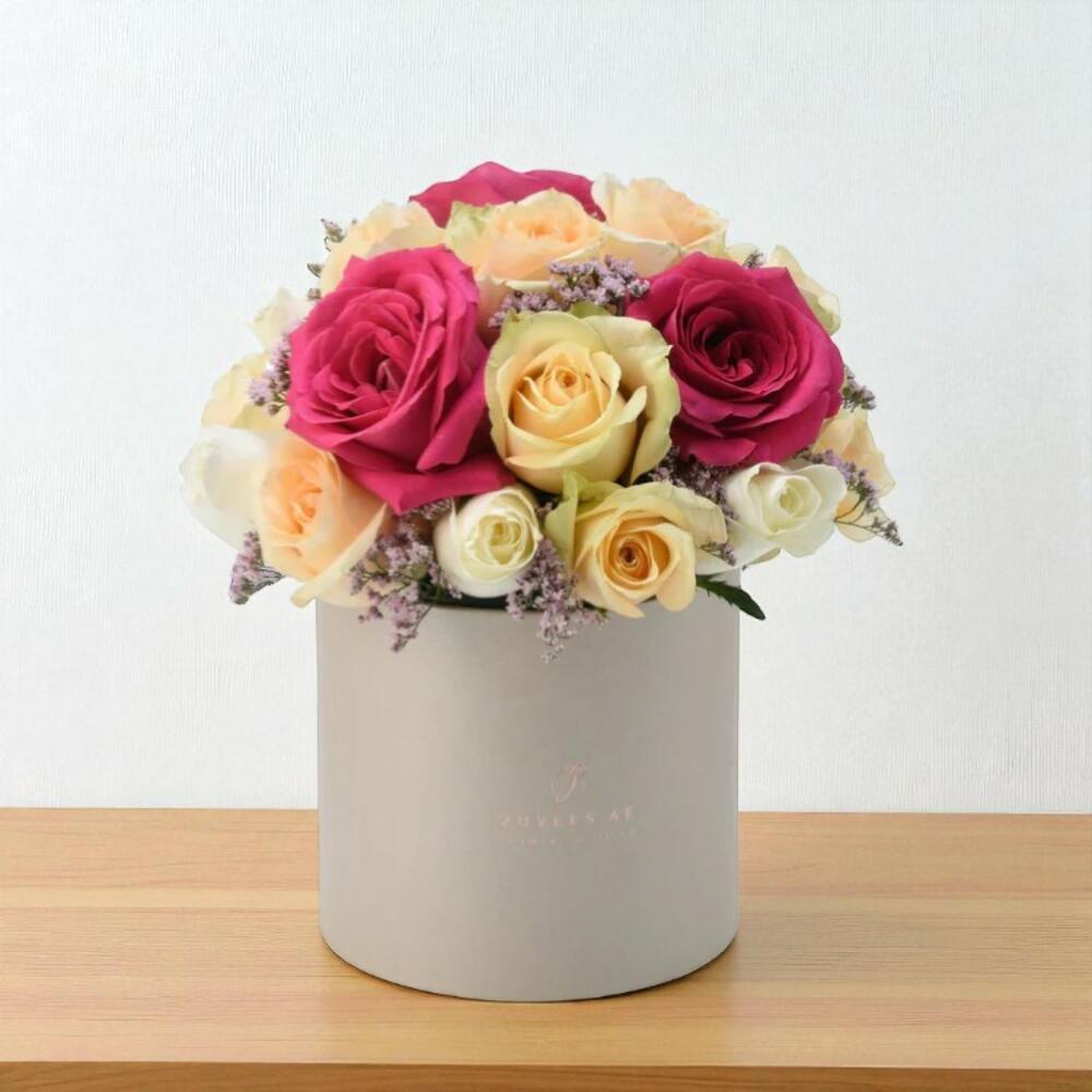 Celebrate timeless beauty and affection with the Elegant Mixed Rose Box, a chic and graceful arrangement handcrafted with 3 dark pink roses, 8 peach roses, and 8 white roses, delicately complemented by soft pink limonium fillers. This radiant composition is artfully displayed in a premium round hatbox, exuding charm, sophistication, and warmth. Designed for meaningful gestures, this bouquet is a standout gift for birthdays, anniversaries, or heartfelt surprises, sure to leave a lasting impression. Care Instructions: Keep the flower box in a cool, shaded area, away from direct sunlight and heat. If the box includes floral foam, ensure it remains moist by lightly adding a small amount of clean water to the center of the arrangement every 1–2 days. Handle the arrangement gently, and avoid tilting to maintain its shape and balance. For longer-lasting beauty, display in a well-ventilated room and mist lightly for freshness.