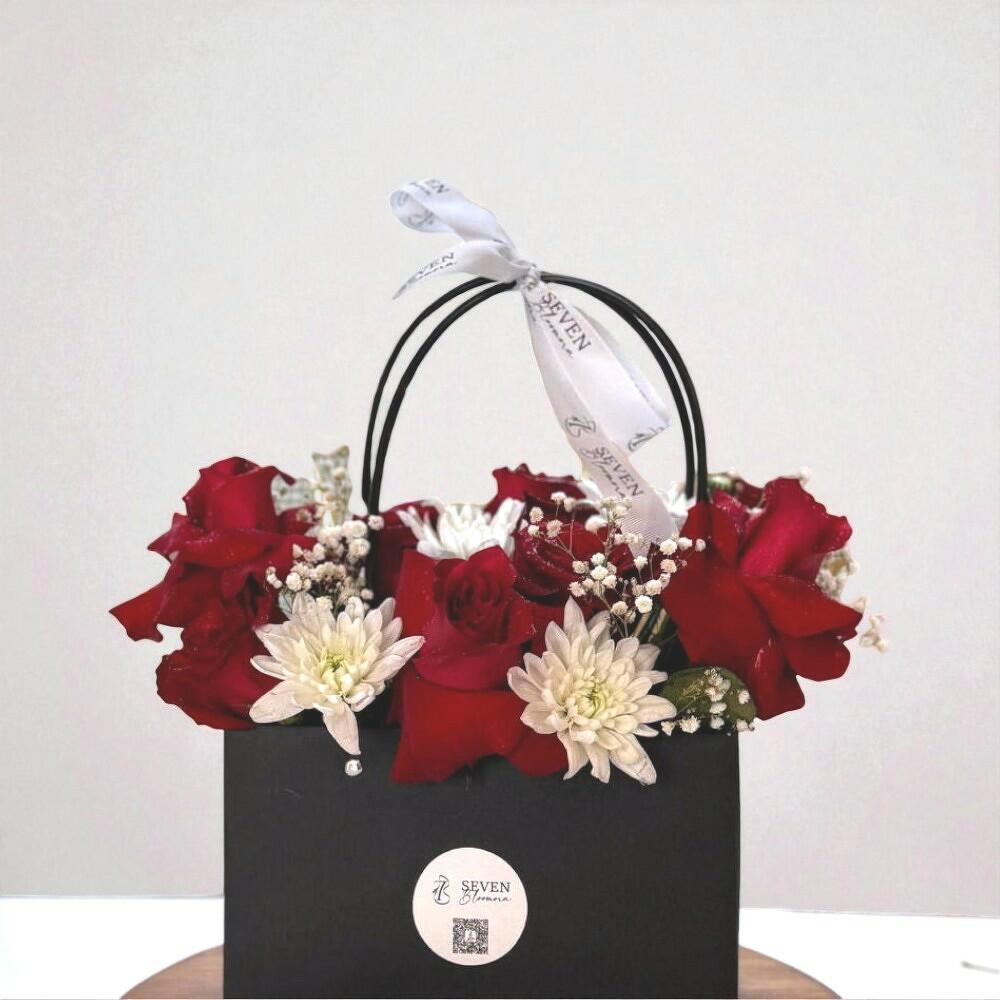 This elegant flower box is a perfect balance of passion and tenderness. Deep red roses symbolize love and admiration, while snow-white chrysanthemums and delicate gypsophila add purity and charm. Arranged in a black designer box with a handle and branded ribbon, this bouquet is ideal for a romantic gesture, a festive occasion, or simply to bring joy to someone special. Its compact yet rich composition makes it easy to gift without the need for a vase. Keep the box in a cool place, away from direct sunlight and heating devices. Water the floral foam inside the box every 1–2 days with a small amount of clean water to maintain freshness. Remove wilted flowers in time to let the bouquet stay beautiful longer.