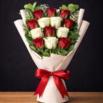 A dazzling display of Florists Specials, our arrangement features a tastefully chosen combination of 8 opulent red roses and 5 pristine white roses. Tucked in beautifully is a pair of ethereal Gypsophila, known for their starry charm. Enhanced by 5 pieces of versatile decorative greenery, the floral parade exudes a sense of freshness and vibrancy. The bouquet is nattily bound using a striking piece of red ribbon. It is finally enshrined in our high-quality designer wrapping paper - three subtle pieces that amplify the overall aesthetic allure of the ensemble. A bouquet that is fantastical yet elegant, designed to capture hearts!