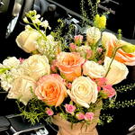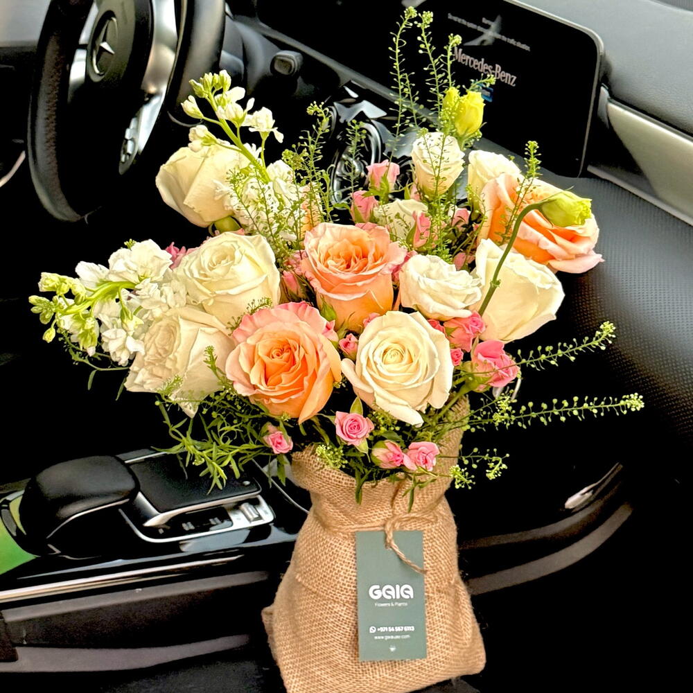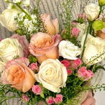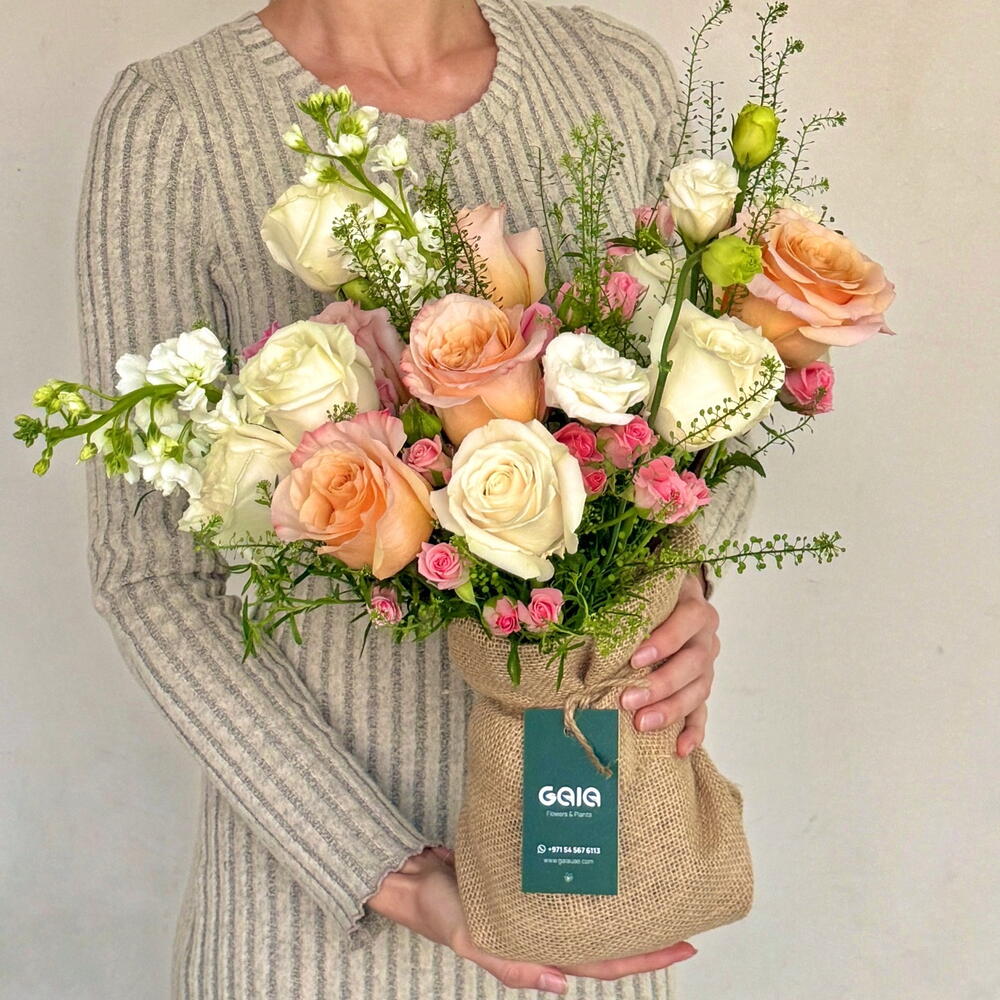 Embrace sophisticated charm with this hand-crafted masterpiece. We have curated a delicate balance of glowing Shimmer roses and pristine white roses, accented by the textured beauty of white mathiola and soft pink spray roses. This arrangement is designed to bring a touch of airy, high-end luxury to any space. 🍑🤍 👀 Best For: Birthdays, Gratitude Gifts, Romantic Surprises, or an elegant Housewarming gesture. ✨