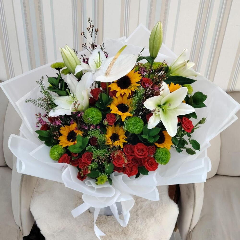 A vibrant mix of sunflowers, lilies, baby roses, and pingpong blooms, beautifully arranged to brighten any celebration or occasion.