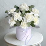 Discover the serene beauty of our Pure White Carnations bouquet, thoughtfully arranged in a chic white hat box. This elegant presentation features 15 pristine white carnations, symbolizing pure love, good luck, and admiration, perfectly complemented by lush green eucalyptus foliage. An Exquisite Expression of Grace: 11 Premium White Carnations: Each bloom is carefully selected for its pristine white petals and full, delicate texture, creating a cloud-like display of natural beauty. Chic White Hat Box: Presented in a sophisticated, reusable white hat box, this arrangement offers a modern and luxurious gifting experience. The box not only adds to the aesthetic but also provides a convenient way to display the flowers. Fresh Eucalyptus Accents: Sprays of aromatic eucalyptus add a touch of contemporary elegance and a symbolic meaning of protection and freshness, enhancing the bouquets visual appeal. Versatile Gifting: Ideal for conveying heartfelt condolences, celebrating new beginnings, expressing sympathy, or as a serene centerpiece for any home or office. Its timeless elegance makes it suitable for numerous occasions. Exceptional Longevity: Carnations are renowned for their impressive vase life. Our fresh blooms, combined with proper care, will bring lasting joy and beauty for an extended period. Reliable Same-Day Delivery in Dubai: Experience our prompt and professional delivery service across Dubai, ensuring your pristine gift arrives fresh and on time to make a lasting impression. Care Instructions: Your carnations arrive beautifully arranged in a box. To ensure their longevity, we recommend adding a small amount of fresh water directly into the box daily. If transferring to a vase, carefully remove the flowers, re-cut about 1 inch from each stem at an angle, and place them in a clean vase with fresh water and the provided flower food. Keep away from direct sunlight, heat sources, and ripening fruit. White Carnations, Carnation Box, Flower Box Dubai, 11 Carnations, White Flowers, Sympathy Flowers, Condolence Flowers, New Baby Flowers, Elegant Flowers, Flower Delivery Dubai, Same Day Flowers, Hat Box Flowers, White Floral Arrangement, Eucalyptus Flowers, Dubai Florist.