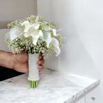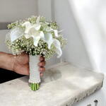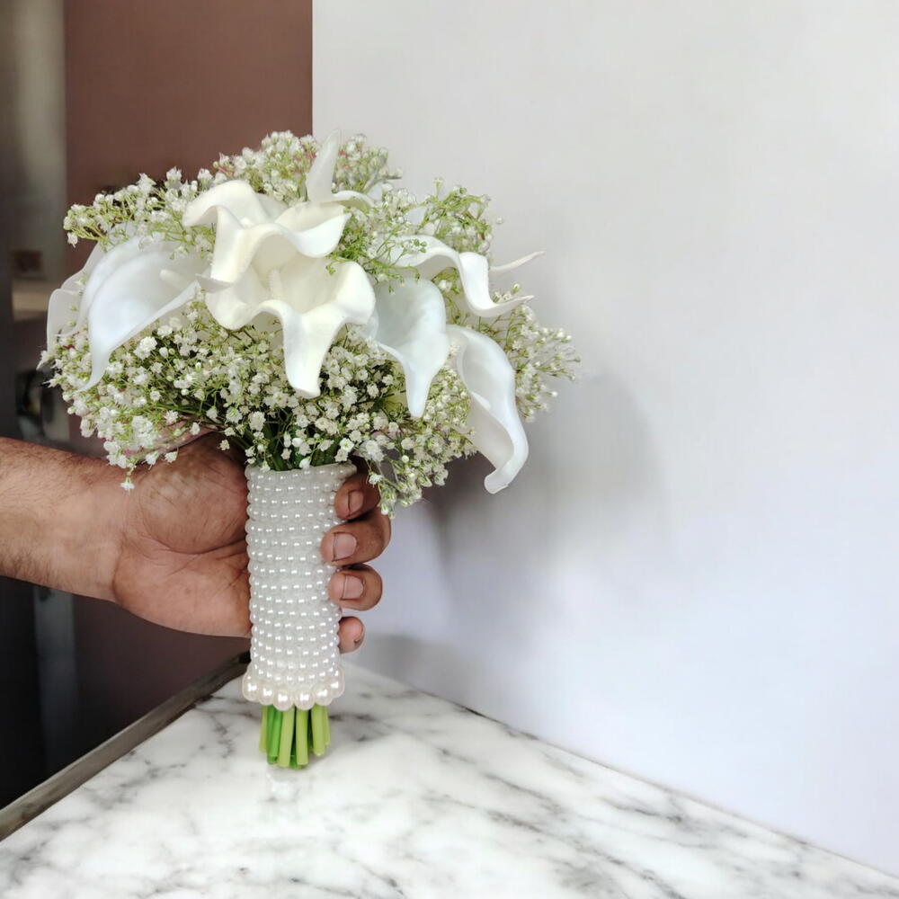 Flowers Used: White calla lilies, baby’s breath (gypsophila) Style: Hand-tied mini bridal bouquet Handle: Pearl-wrapped grip for an elegant finish Color Theme: Pure white Size: Small to medium (ideal for bride or bridesmaid) Occasion: Weddings, engagements, formal events Presentation: Neatly arranged with clean stem finish