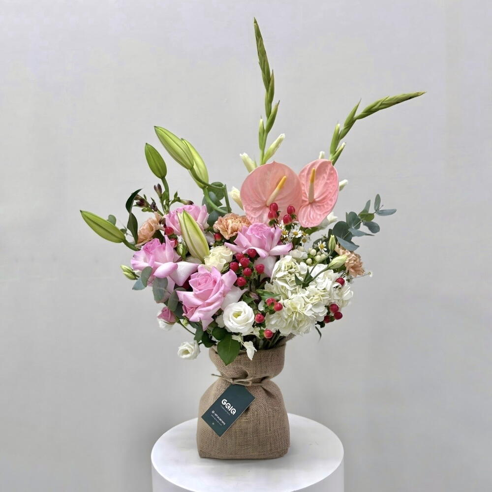 Command attention with this stunningly luxurious and uniquely structured arrangement. We have masterfully combined the exotic, glossy beauty of pink Cheers anthuriums with the soaring elegance of white gladioli and fragrant white lilies. 🌸✨ 👀 Best For: High-End Corporate Gifts, Sophisticated Anniversaries, Elegant Birthdays, or a Congratulations that truly stands out. 🥂🥰