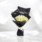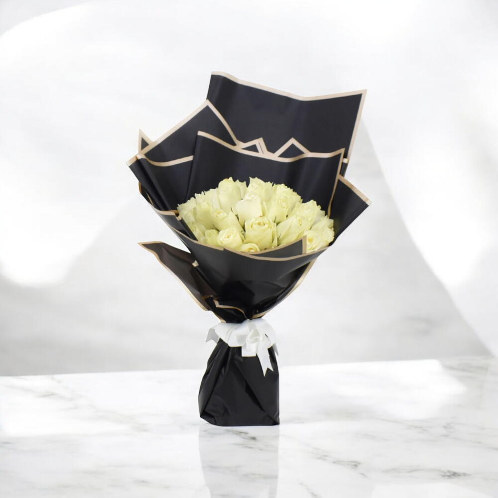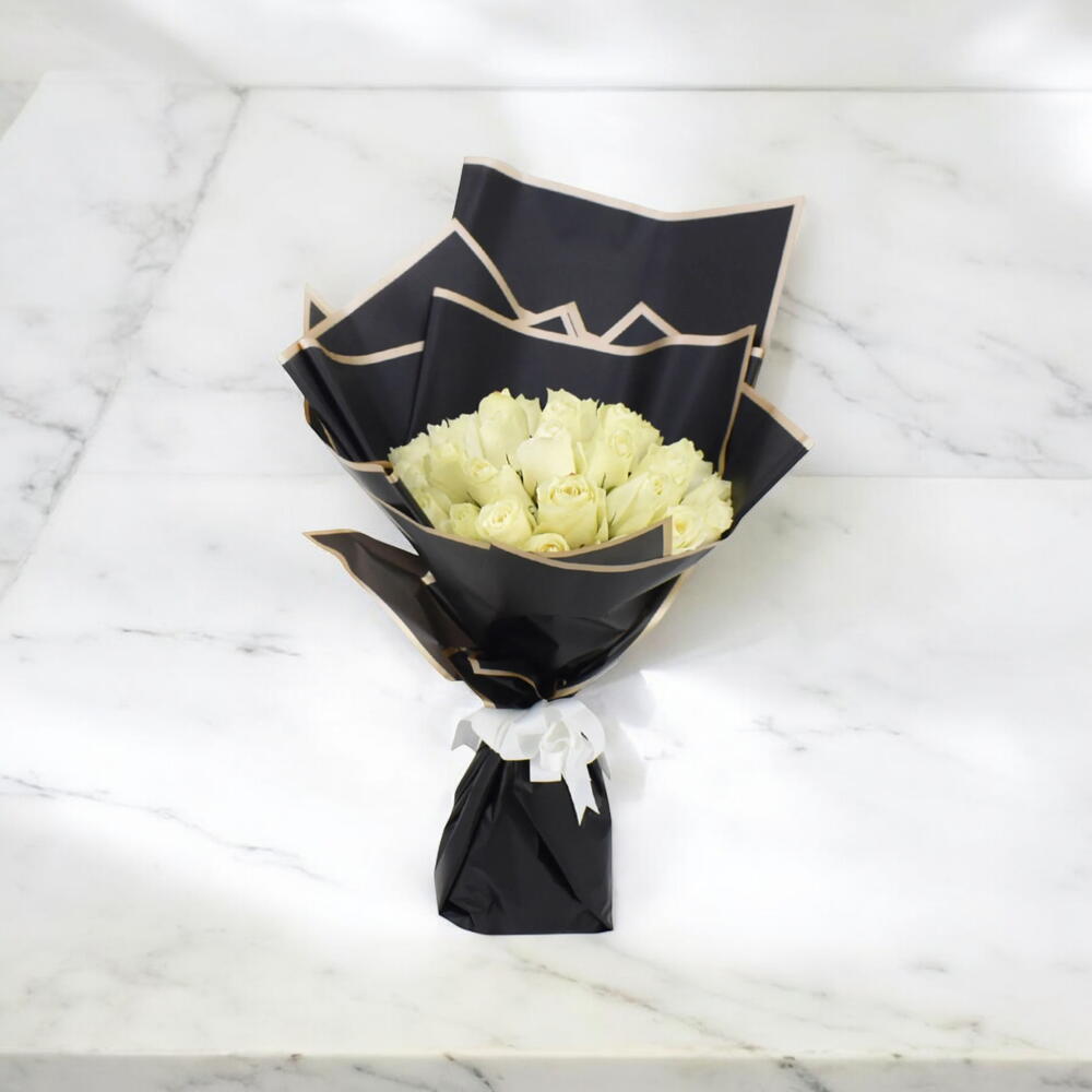 Flowers: Fresh white roses Quantity: 15 roses Wrap: Black luxury wrapping paper with beige trim Ribbon: White satin bow Style: Modern, chic, and minimal