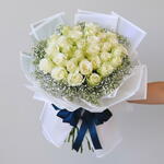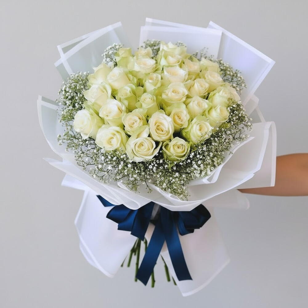 This elegant bouquet of creamy white roses embodies purity, grace, and timeless beauty. The soft ivory tones are beautifully complemented by delicate clouds of gypsophila, creating a light and romantic composition. Translucent white wrapping and a deep navy ribbon add a modern, refined contrast that makes the bouquet look sophisticated and luxurious. It is an ideal choice for weddings, anniversaries, birthdays, or as a thoughtful gesture of appreciation and sincerity. The bouquet has a harmonious, full shape that looks stunning both in hand and in a vase. To keep the flowers fresh, place them in clean, cool water immediately, trim the stems at a 45-degree angle every 1–2 days, change the water daily, and keep the bouquet away from direct sunlight, heat sources, and drafts.