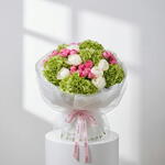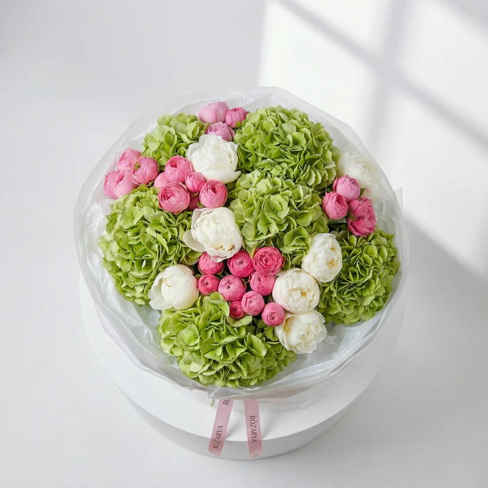 A fresh and elegant bouquet in green, white, and pink shades, arranged with lush hydrangea and delicate ranunculus. Bright, modern, and eye-catching, this bouquet is a beautiful choice for birthdays, Mother’s Day, women’s celebrations, and stylish gifting. • Please Note: As flowers are natural products, actual colors may vary slightly from digital images due to seasonal growth and lighting conditions. We guarantee that the overall style and premium quality as well as freshness of your arrangement will always be maintained.