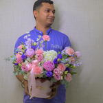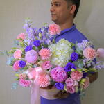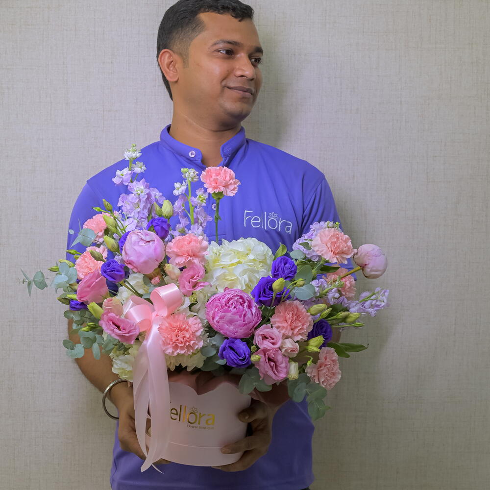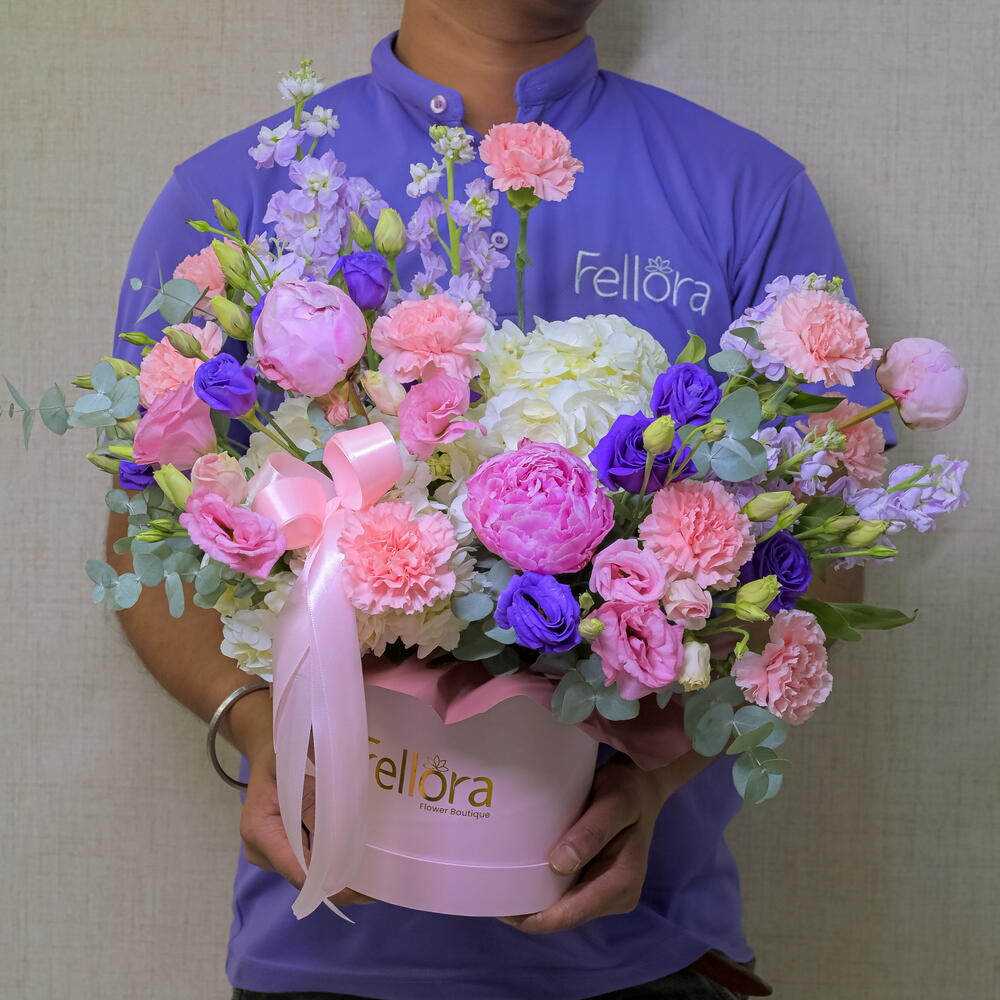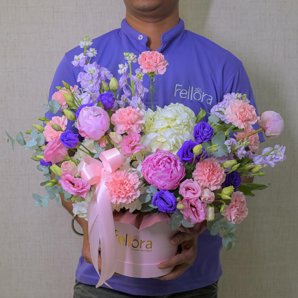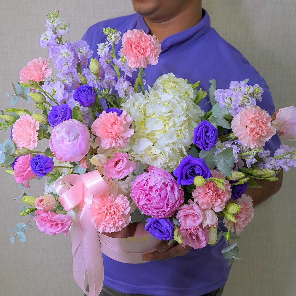 Eucalyptus - 4 pcs pink peony - 3 pcs pink lisianthus - 4 pcs purple lisianthus - 5 pcs purple mathiola - 5 pcs pink carnation - 9 - 9 pcs white hydrangia - 2 pcs pink paper box - 1 pcs