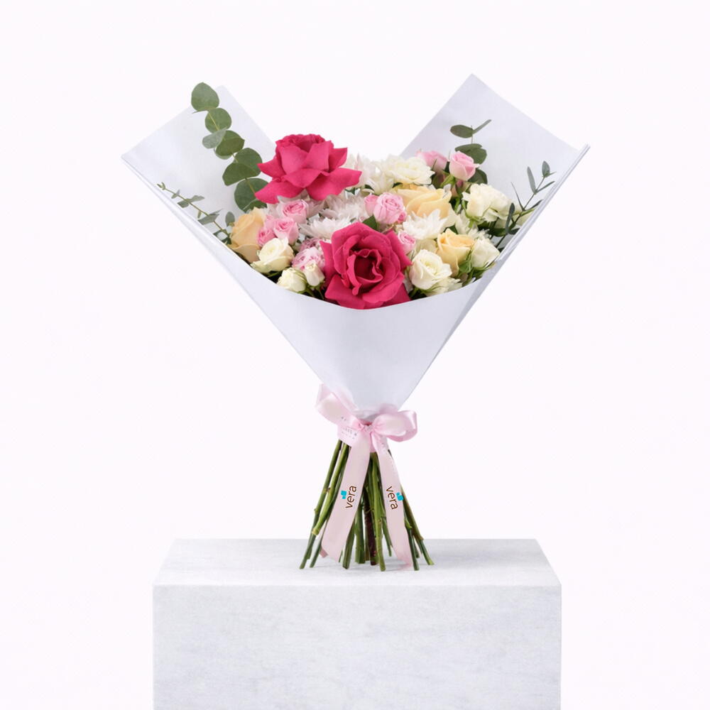 Eucalyptus - 3 pcs white chrysanthemum - 3 pcs peach rose - 3 pcs fuchsia rose - 2 pcs white baby rose - 3 pcs pink baby rose - 3 pcs