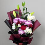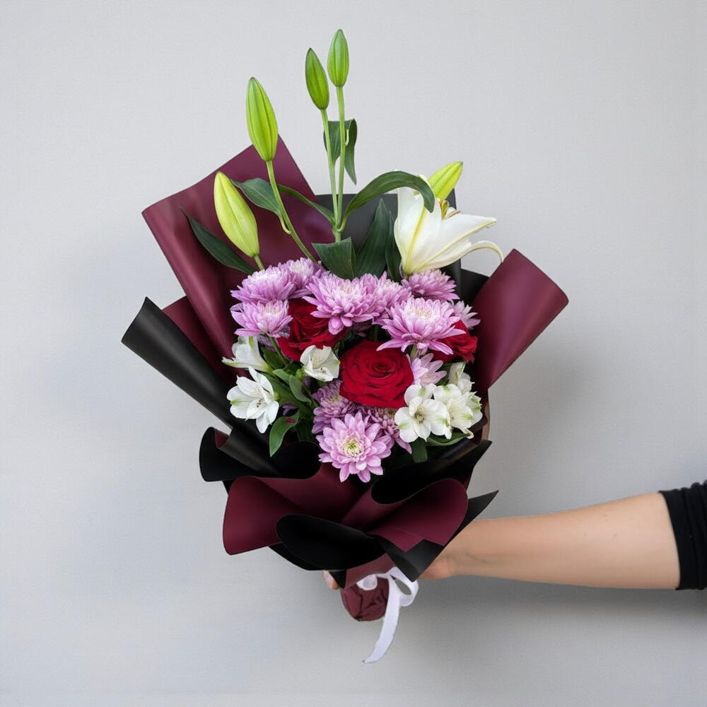 A stunning arrangement of lilies, roses, chrysanthemums, and alstroemeria, elegantly wrapped in black and burgundy paper. This bouquet brings together the beauty of different flowers to create a truly eye-catching and luxurious floral gift. Perfect for birthdays, anniversaries, celebrations, or simply to brighten someone’s day! Trim the stems diagonally and place them in fresh, clean water. Keep the bouquet away from direct sunlight and drafts to maintain freshness. Change the water every two days for long-lasting beauty.