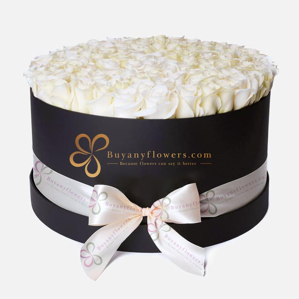 Product details 90 to 120 white roses in xxl black round box and tied with white ribbon.