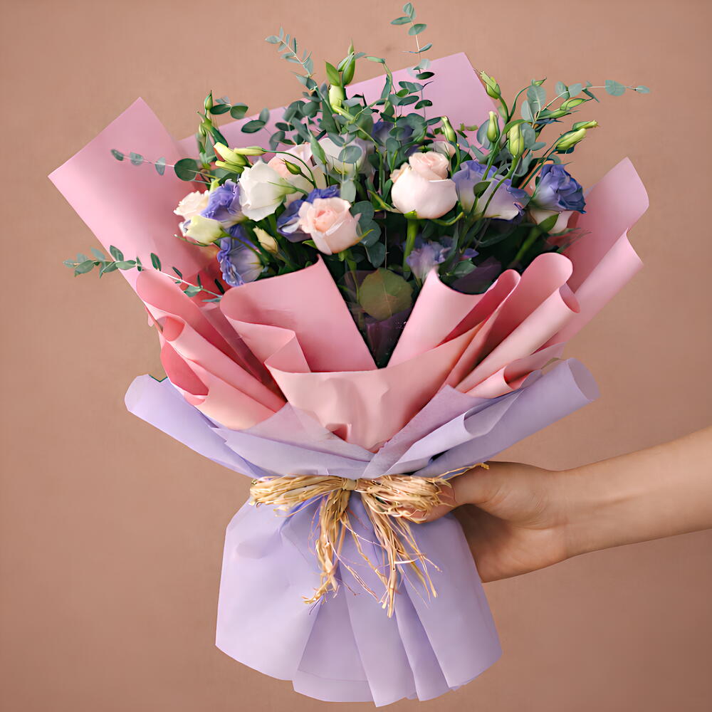 Indulge in the mesmerizing beauty of our mixed bouquet featuring a delightful fusion of pink roses, lishanthus in shades of purple, adorned with fresh eucalyptus leaves. Each bloom is carefully selected to create a harmonious blend of colors, perfect for expressing love, gratitude, or admiration. Whether its a romantic gesture or a heartfelt token of appreciation, this enchanting bouquet is sure to captivate hearts and leave a lasting impression.